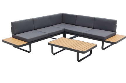 Sofá rinconera, mesa auxiliar y mesa de centro con madera plástica.